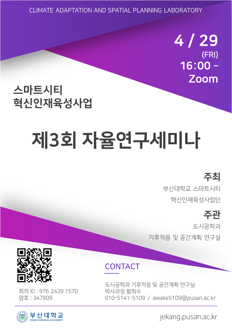 fnctId=bbs,fnctNo=3413 작성일 2022.04.25 수정일 2022.04.25 작성자 도시공학과 조회수 174 스마트시티 혁신인재육성사업 자율연구세미나(제 3회) 2022년 스마트시티 혁신인재육성사업 제2회 자율연구 세미나를 안내합니다.자세한 사항은 첨부된 포스터 참고 바랍니다. 첨부파일 첨부파일이(가) 없습니다.