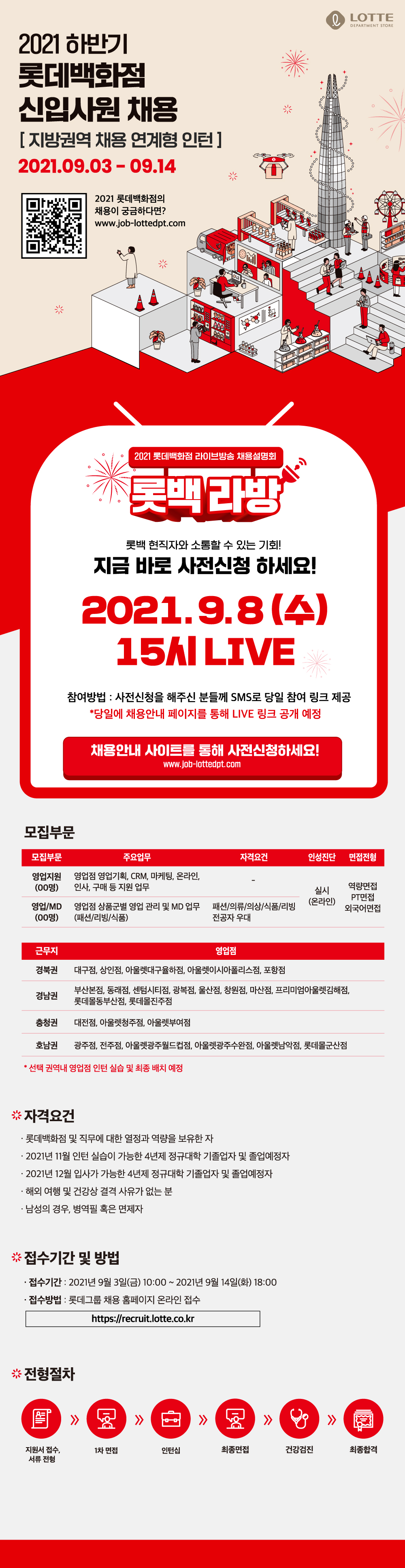 fnctId=bbs,fnctNo=3415 작성일 2021.09.03 수정일 2021.09.03 작성자 도시공학과 조회수 578 [채용 ]2021 하반기 롯데백화점 신입사원 (지방권역 채용연계형 인턴) 사전신청 사이트(바로가기) 지원서 접수 사이트(바로가기) 첨부파일 첨부파일이(가) 없습니다.