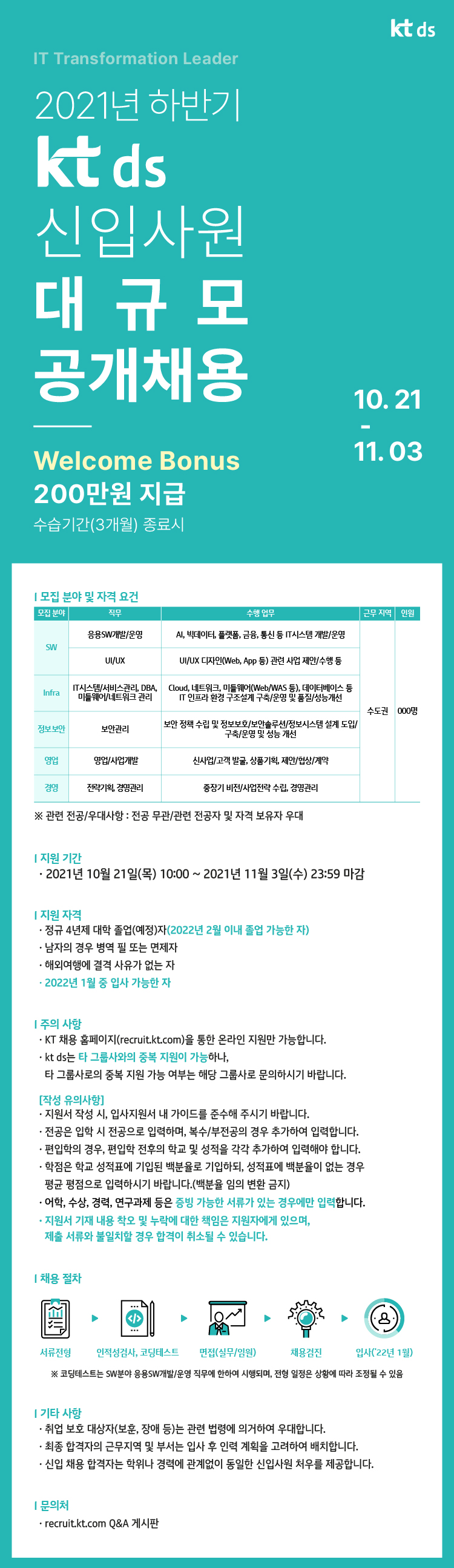 [채용] 2021 하반기 kt ds 신입사원 대규모 공개채용 (~11.03(수))